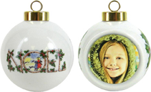 Noel Ball Ornaments Heirloom Noel Ball Ornaments - Each Ceramic Ball Ornament (3"H x 2.5"W x 2"D) comes with a Gold Accented Hanger String and is pre-printed with "NOEL" and "Holly Leaves" graphics. You add your photo or artwork for a treasured memory!