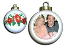 Poinsettia Ornaments Heirloom Poinsettia Ball Ornaments - Each Ceramic Ball Ornament (3"H x 2.5"W x 2"D) comes with a Gold Accented Hanger String and is pre-printed with Poinsettia graphics. You add your photo or artwork for a treasured memory!