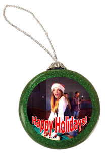 Glitter Ornament Series This 3" green glitter ornament is the perfect holiday gift for family, friends and coworkers this season. Great for photographs of company logos as your full color image can shine with sparkle this year!
